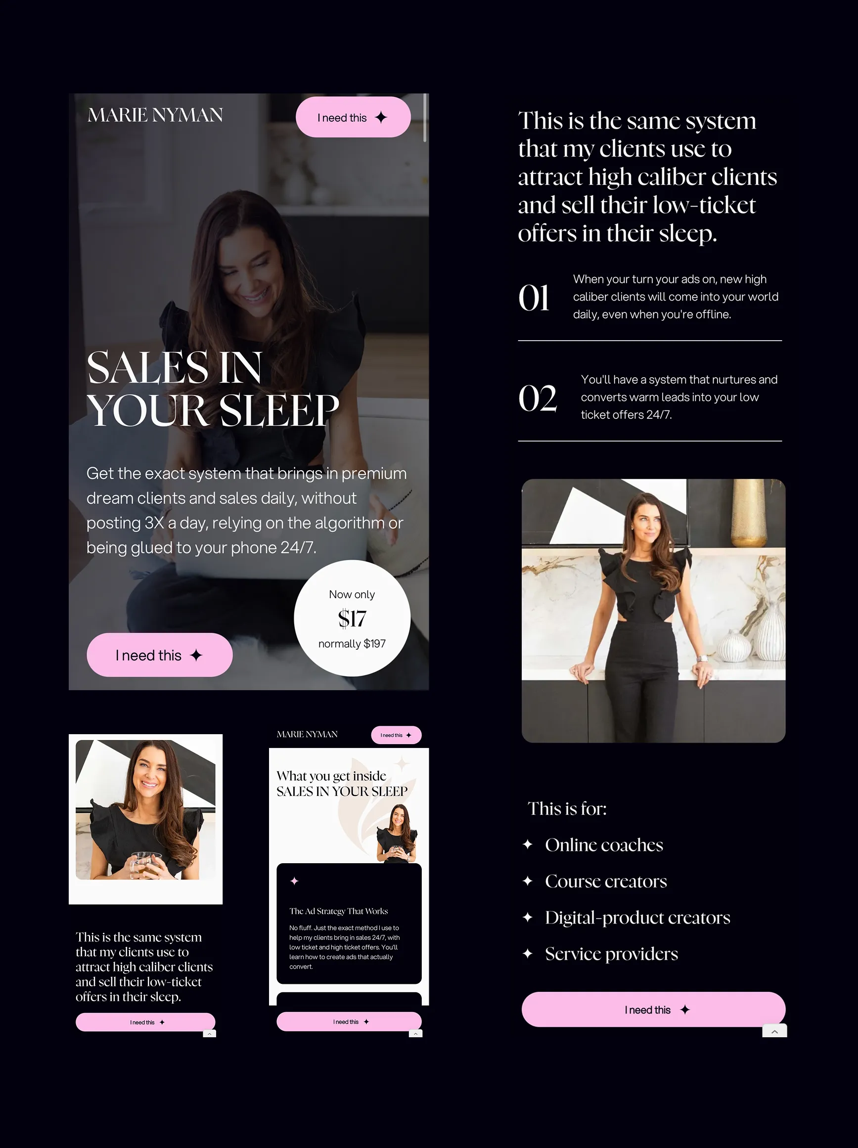 Your high-conversion page for ads, launches, and daily sales. An offer presentation that meets the level you’re selling at.